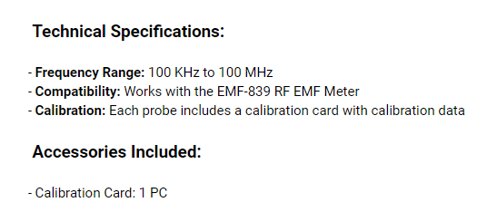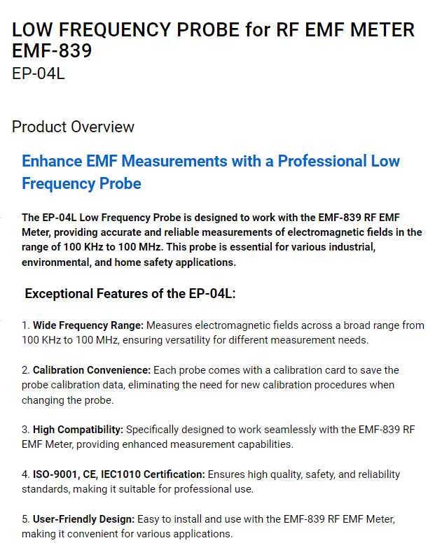 EP-04L低頻探頭設計用於配合EMF-839射頻電磁場儀,提供100 KHz至100 MHz範圍內的電磁場準確可靠測量。該探頭在各種工業、環境和家庭安全應用中至關重要。