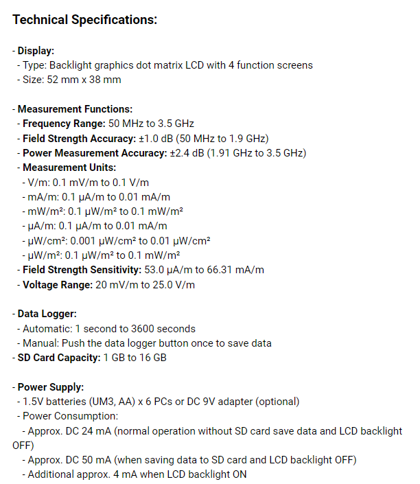 2. 高靈敏度和寬頻範圍:測量高射頻電磁波場強度,頻率範圍從50 MHz到3.5 GHz,涵蓋GSM、CDMA、TDMA、WiFi、藍牙等多種應用。