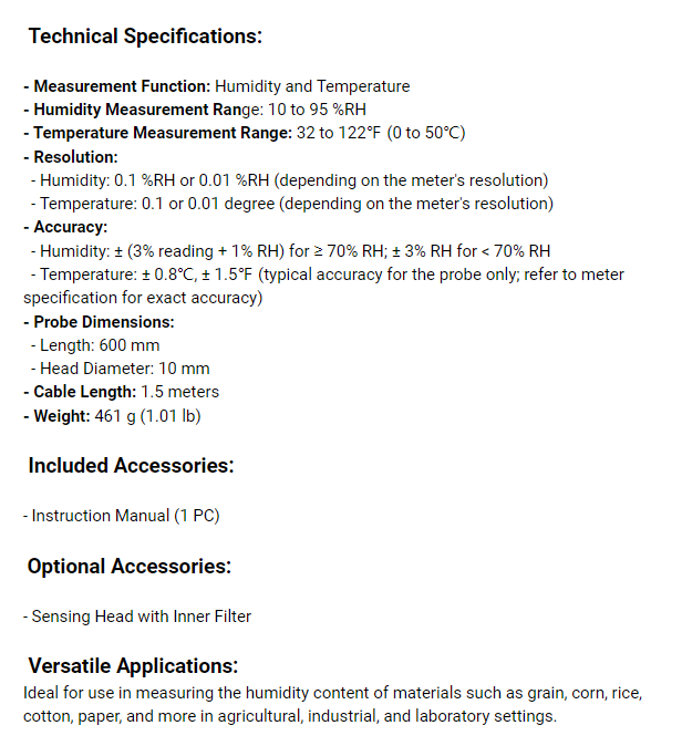 MS-71P濕度含量探頭旨在提供各種材料中濕度的準確可靠測量,是農業、工業和實驗室應用中不可或缺的工具。