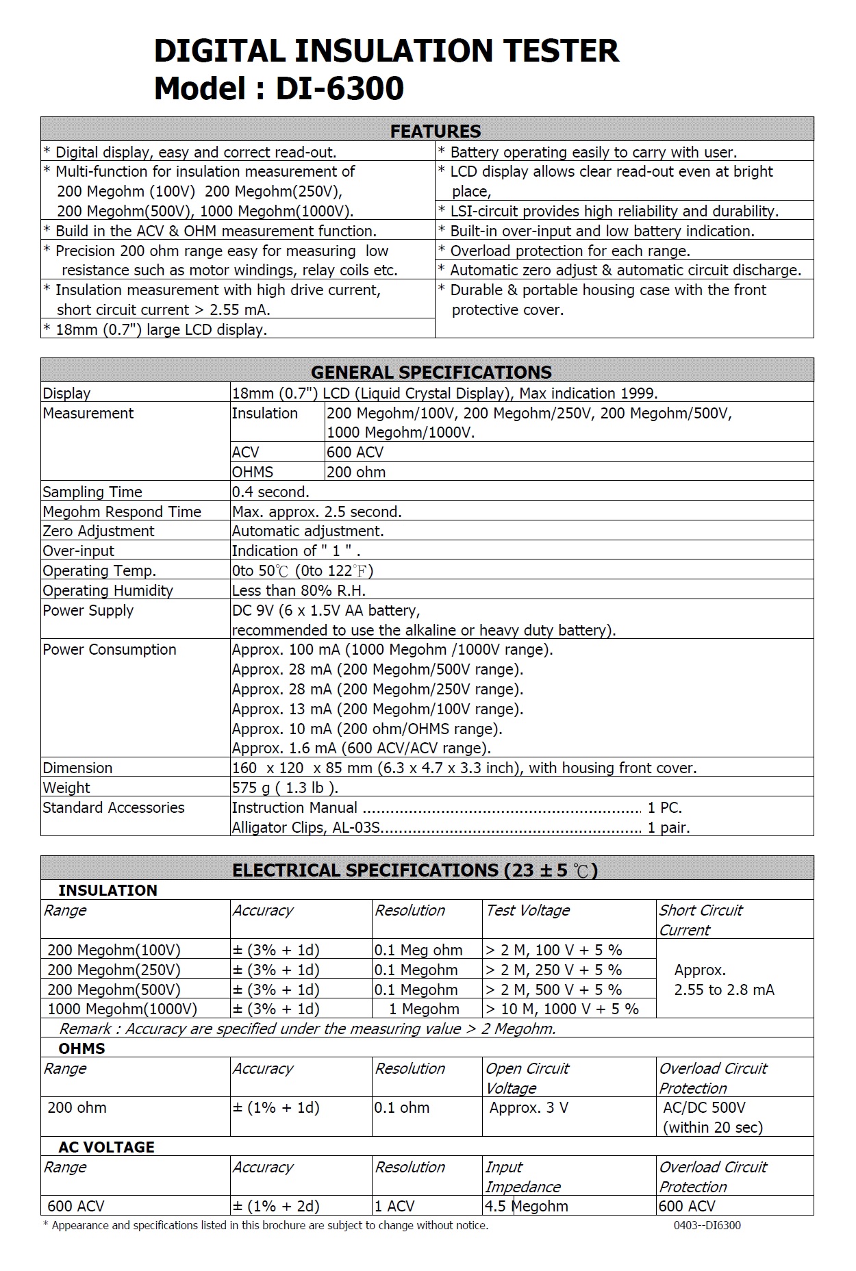 * 200 M ohm (100V), 200 M ohm (250V), 200 M ohm (500V), 1000 M ohm(1000V), ACV, 200 ohms, continuity beeper.