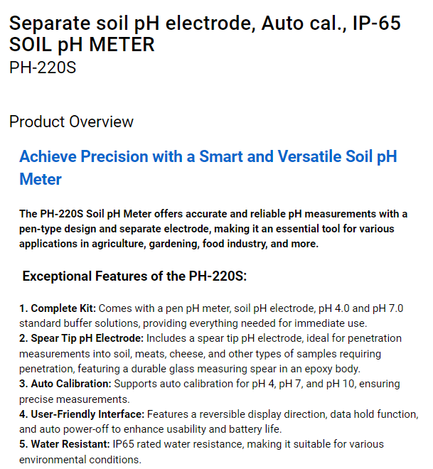 PH-220S 土壤 pH 計採用筆式設計及獨立電極,提供精確且可靠的 pH 測量,是農業、園藝、食品工業等多種應用中不可或缺的工具。