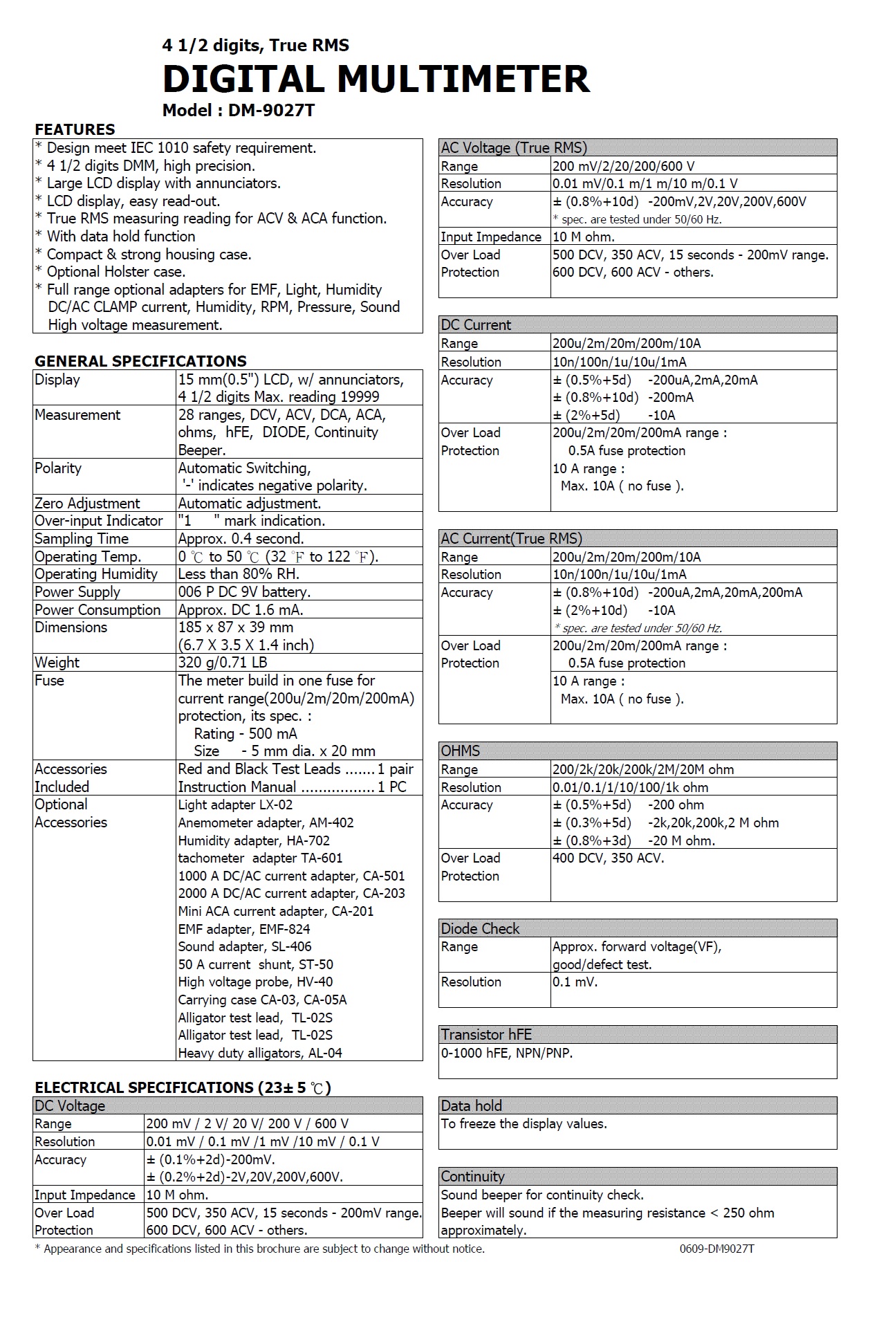 Product Name : | 4 1/2 digits, true rms MULTIMETER - DM-9027T 高精度數字電錶 |