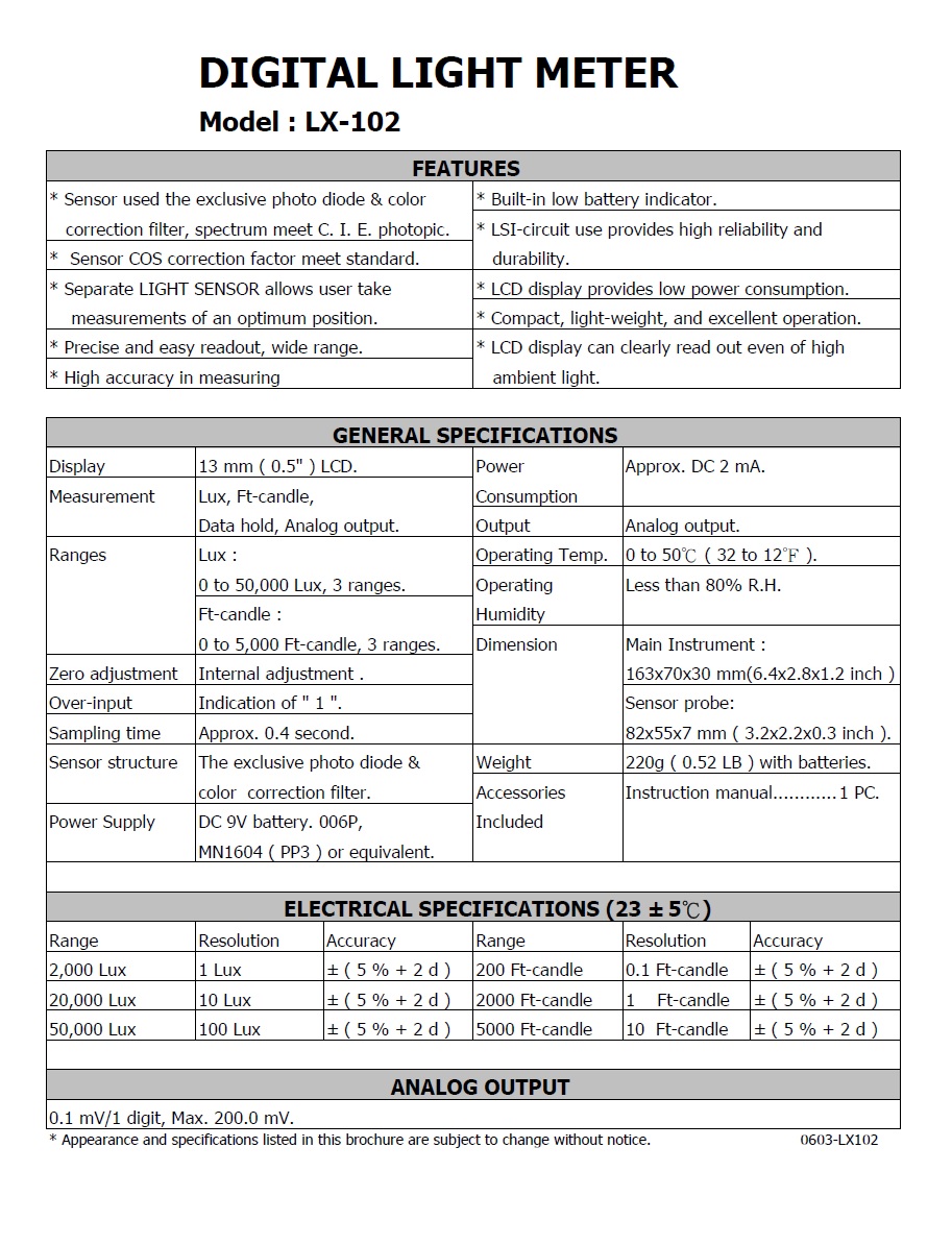 Product Name : | LIGHT METER - LX-102 數字式照度計 |