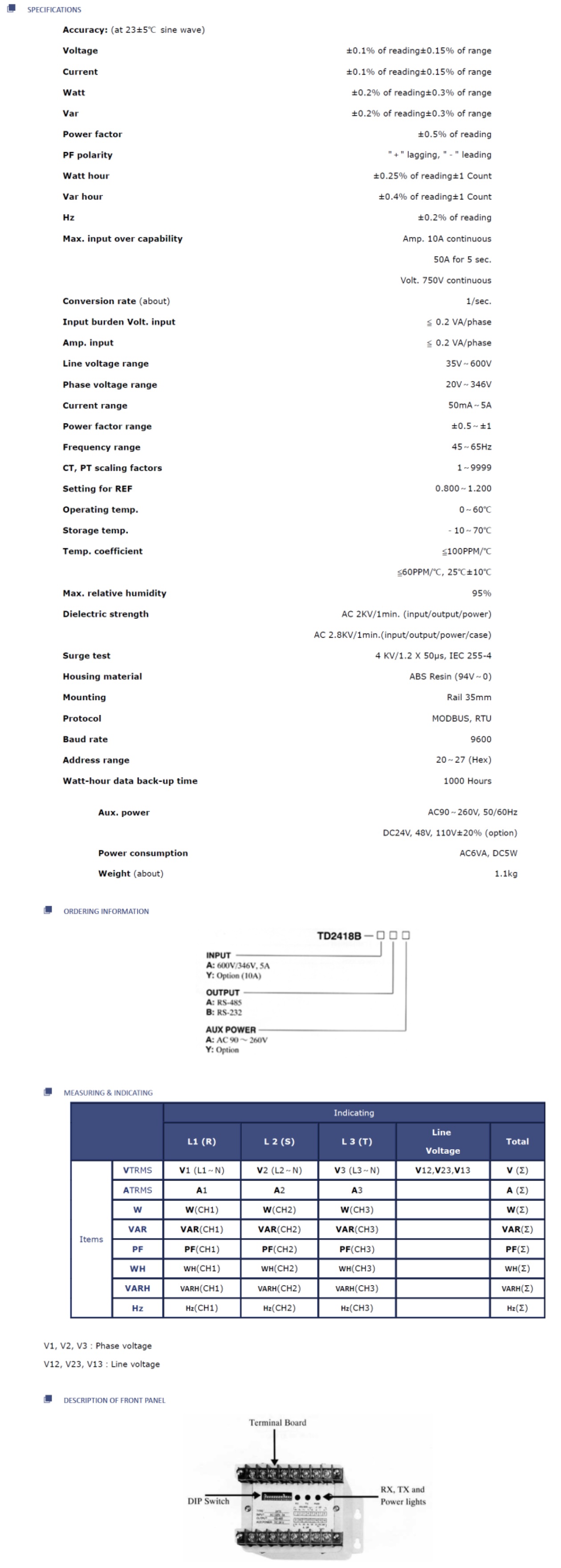 TD2418B not only can take the place of several static con-verters and measuring instruments (V, A, W, PF, VAR, WH, VARH, Hz) by single unit, but also have some special function such as Maximum measuring, Minimum measuring and comparator output. In communication, we use the most convenient and the easiest RS232 or RS485 as our standard output port, besides, we adopt Modbus Protocol, one of the most popular protocol in the world, as our standard protocol.