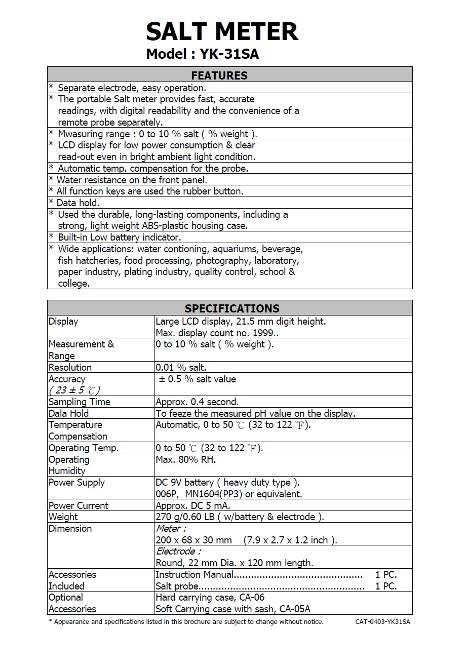 Product Name : | Salt meter - YK-31SA 數字式鹽份計 |