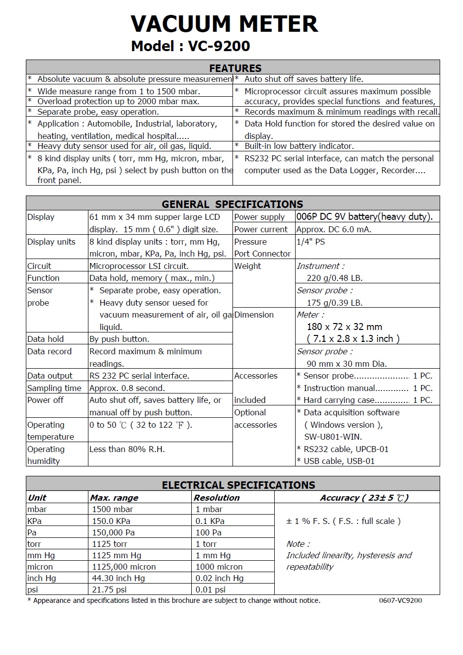 Product Name : | 真空壓力計 VACUUM METER Model : VC-9200 |