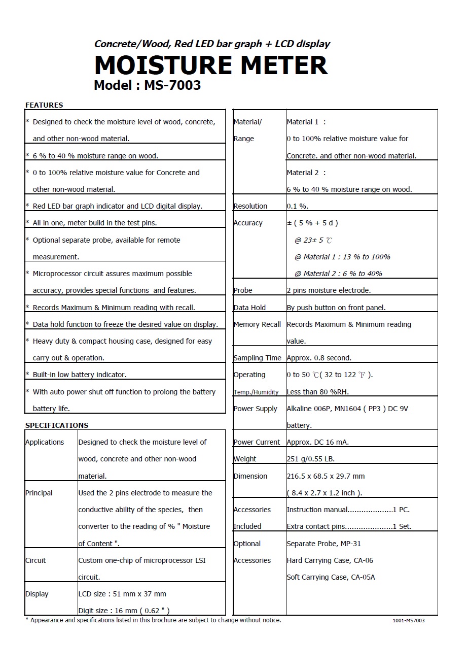 Product Name : | MOISTURE METER - MS-7003 混凝土/木材水分計 |