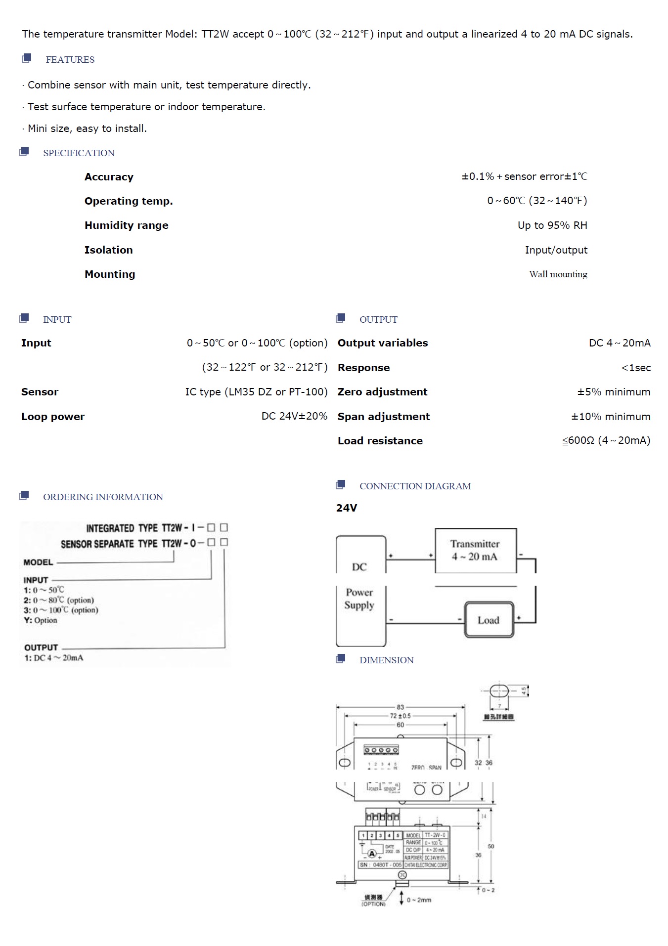 The temperature transmitter Model: TT2W accept 0~100℃ (32~212℉) input and output a linearized 4 to 20 mA DC signals.