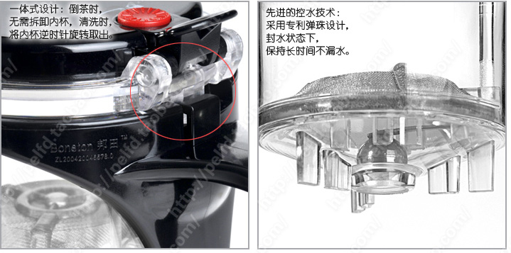 680-500ml超能泡茶杯冲茶器玻璃茶具咖啡杯为茶叶、咖啡冲泡器。其一体式设计使茶与咖啡的冲泡变得更轻松简便。采用100目不锈钢网,即使粉末状咖啡也一样过滤。经过改良的出水按钮,轻按右旋即可松开手指且使内胆长时间保持出水状态,此功能在咖啡的冲泡时尤显重要。内胆的杯口附有密封胶条,其作用在于倾倒外杯内的茶水时内胆茶水不会流出,使得您可以在泡茶的同时倒出外杯内的茶水,从而节省泡茶时间。
