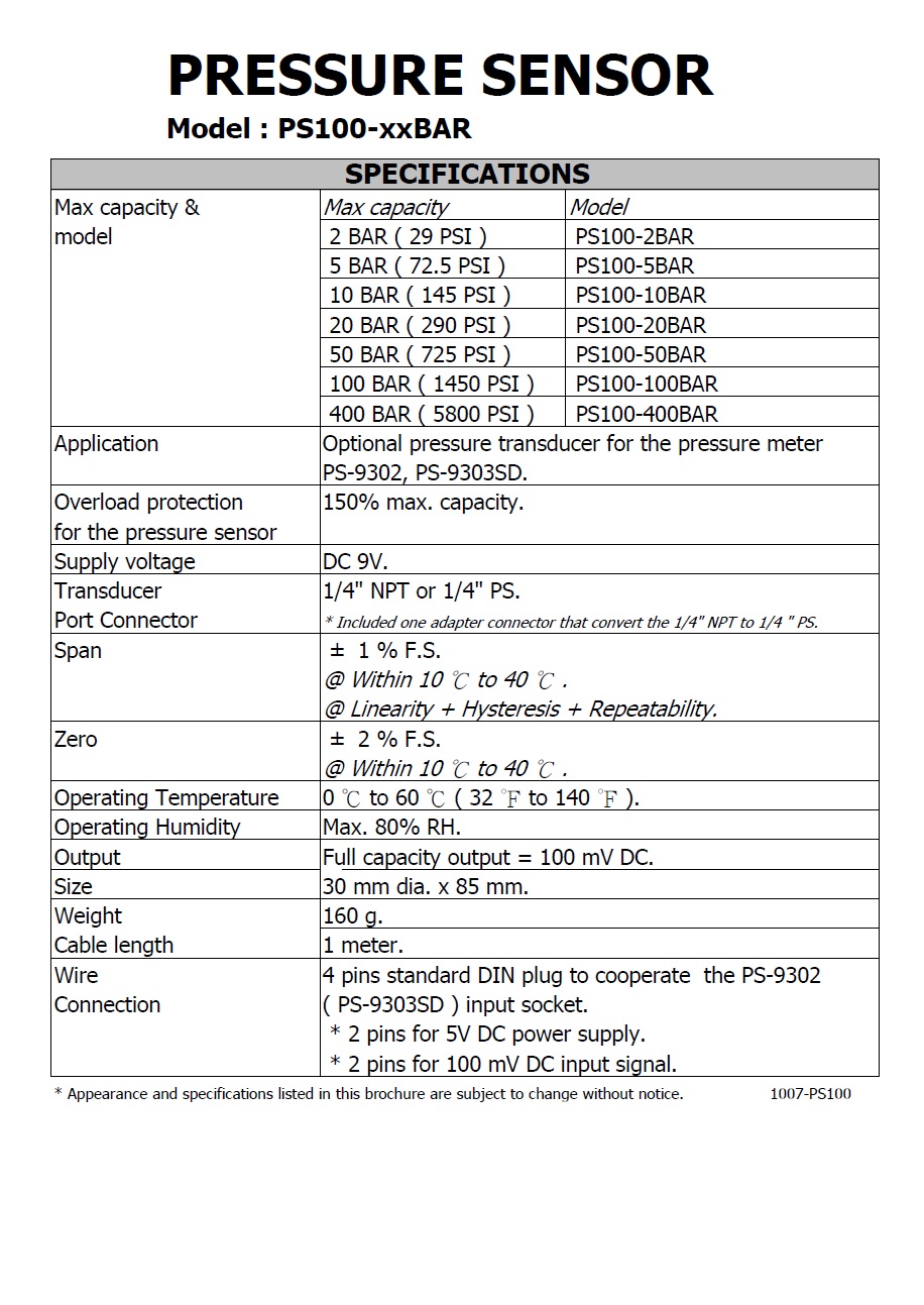 Product Name : | PRESSURE SENSOR - PS100-XXBAR 壓力傳送器 |