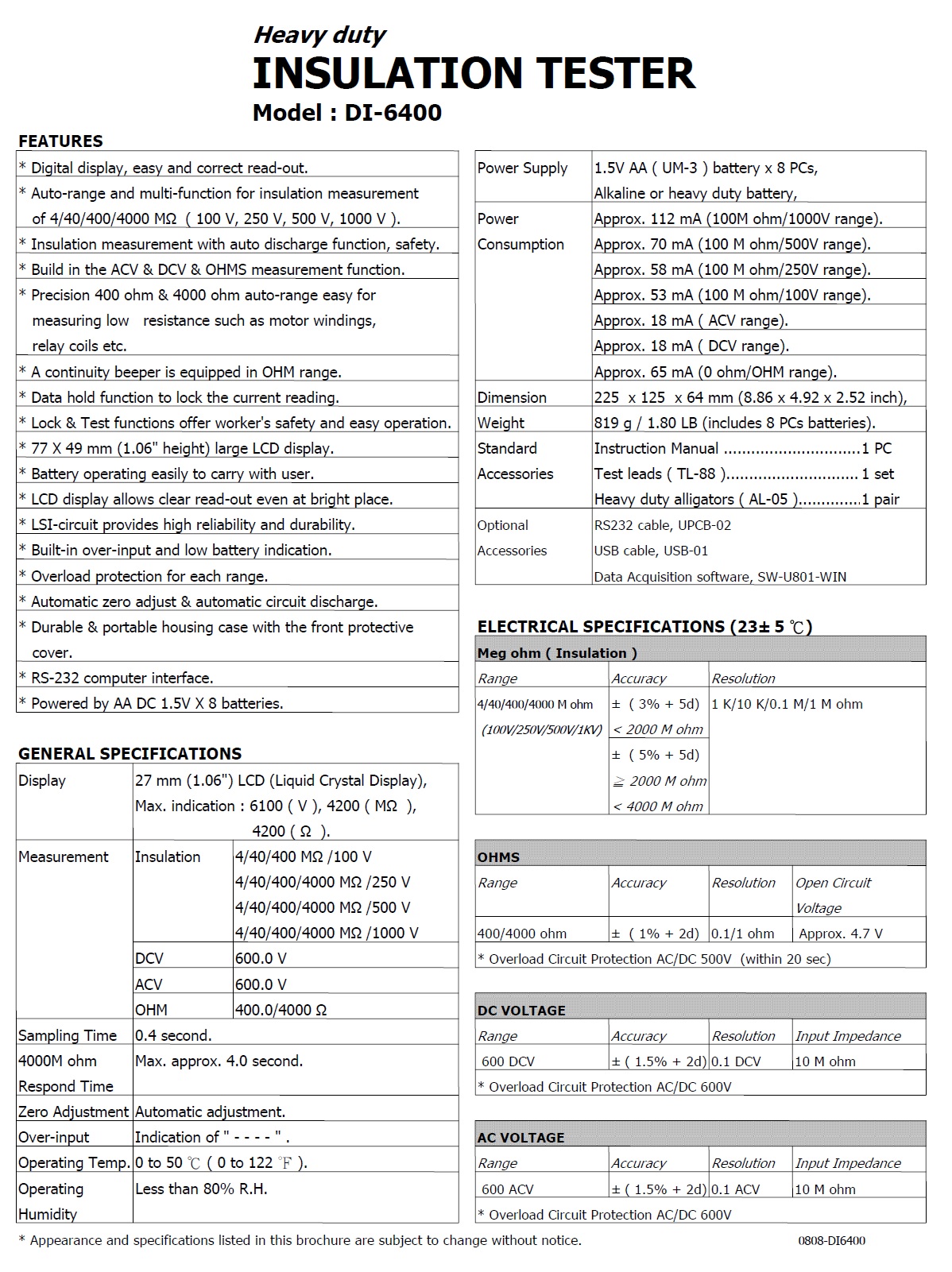 Product Name : | INSULATION TESTER Model : DI-6400 絕緣電阻測試儀 / 絕緣表 |
