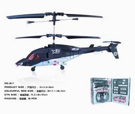 Black Wolf Main rotor diameter is 130mm (5.25-inch) Length: 170mm (6.5-inch) excluding rotors Rear rotor diameter is 30mm (1.25-inch) Product weight: only 10g, including flight battery Rechargeable flight battery: high-capacity integral lithium-polymer battery Charger: integral transmitter/charger supplied with LED indicator/auto shut-off Simply plug-in and charge Easy to use connections Charging time: 6 to 8 minutes for full charge Flight duration: 10 minutes or more between charges Packing Size: 70.5*46*57 CM Certificate: CE/ROHS Batteries required: 6 x 1.5V AA alkaline batteries for transmitter/charger