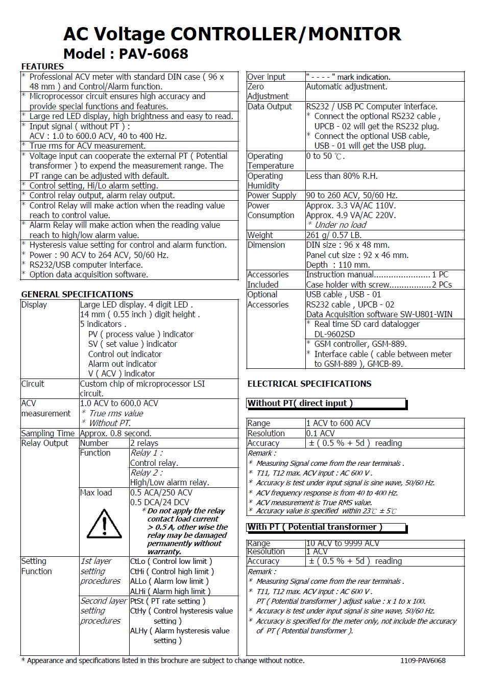 * Input signal ( without PT ) : ACV : 1.0 to 600.0 ACV, 40 to 400 Hz.