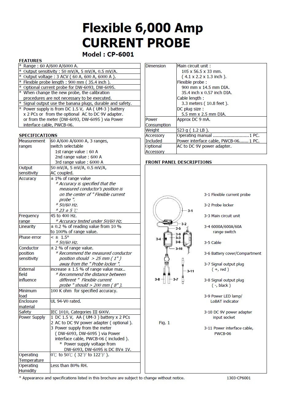Product Name : | 6,000A FLEXIBLE CURRENT PROBE Model : CP-6001 (6000 A 電流鉗表) |