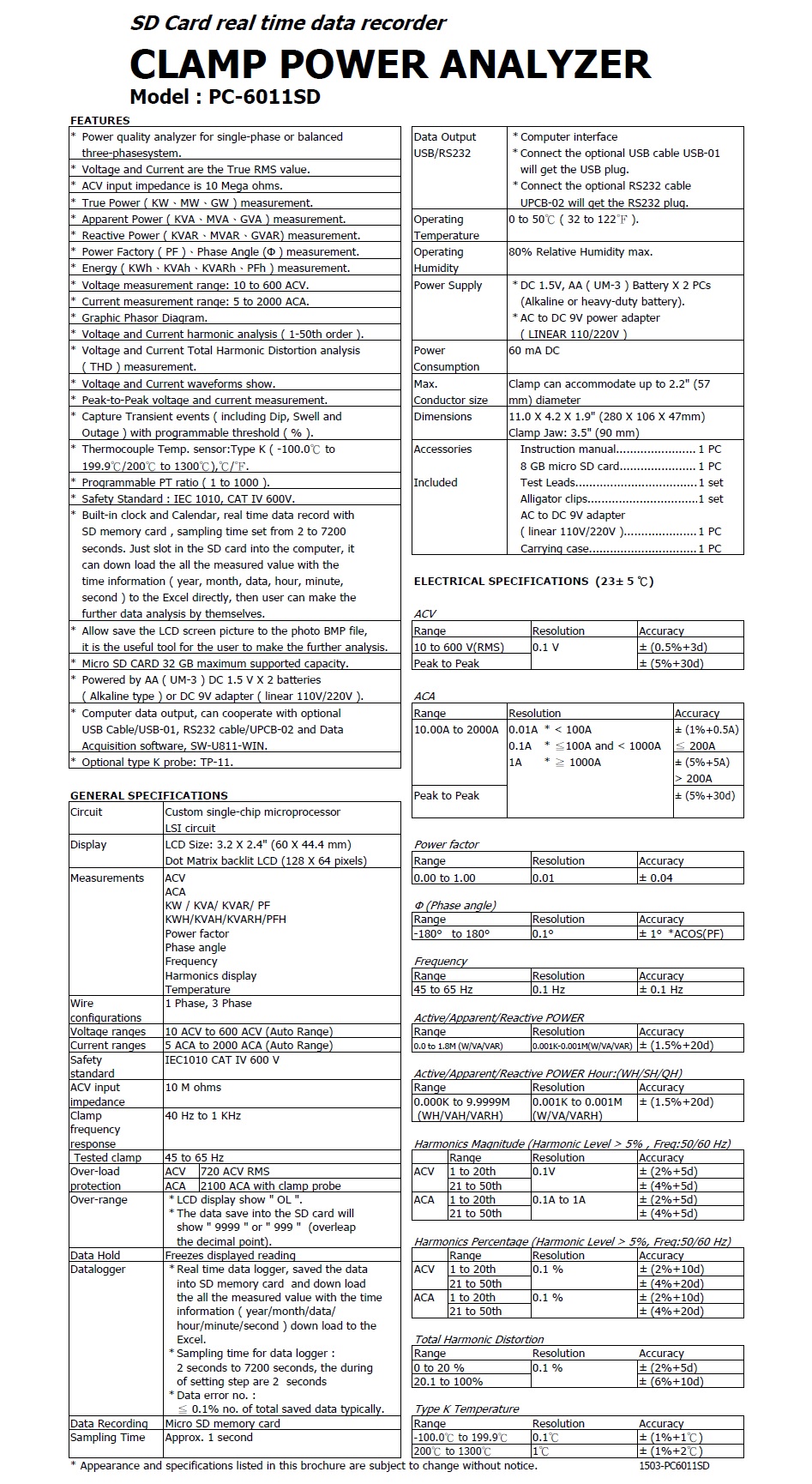 * Applications : Power quality analysis for single and balanced three phase systems.