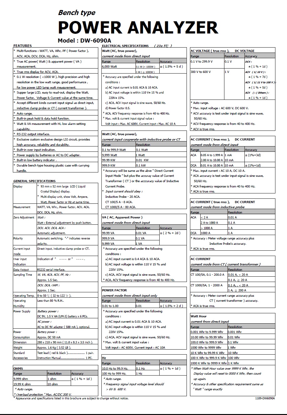 * Watt, VA, Power factor, ACV, ACA, VAr, Whr, DCV, DCA, ohms, RS-232.
