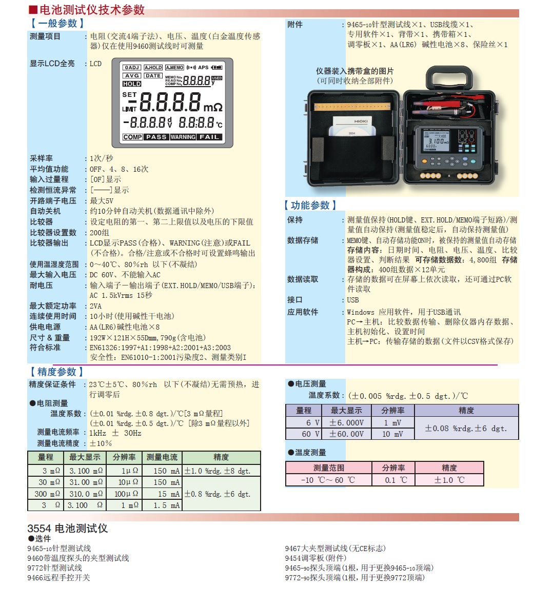 附件 针型测试线 9465-10 × 1,USB连接线 × 1,应用软件CD × 1,携带盒 × 1,吊带 × 1,LR6碱性电池 × 8,备用保险 丝 × 1,调零板 × 1,使用说明书× 1