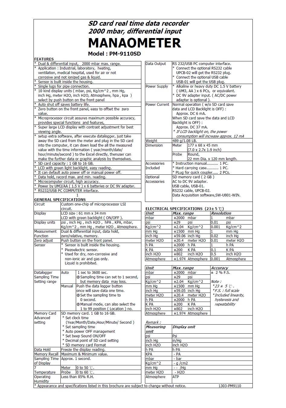 Product Name : | MANOMETER, 2000 mbar Model : PM-9110SD 記憶式壓力計/差壓計 |