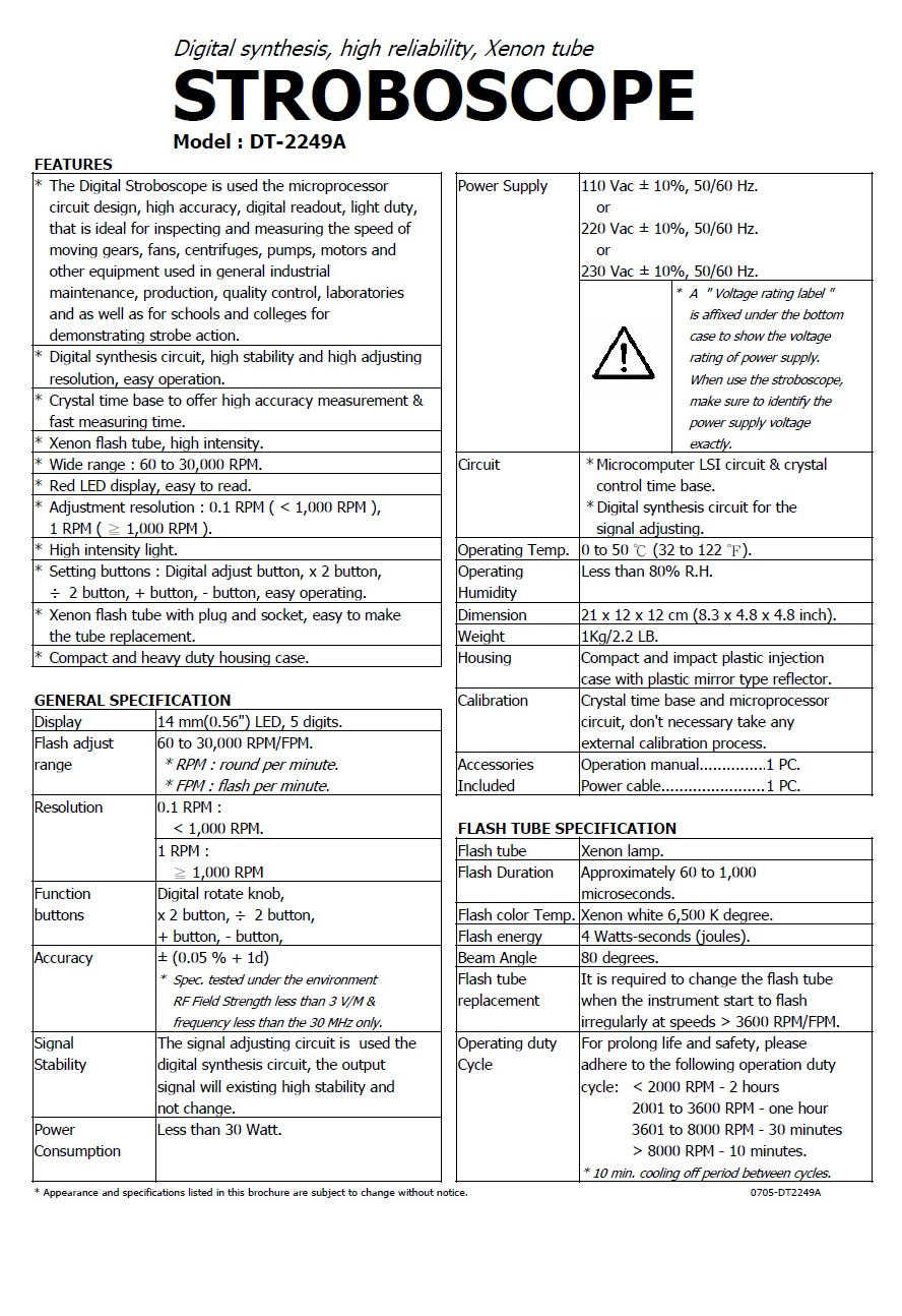 Product Name : | STROBOSCOPE digital synthesis, high intensity light - DT-2249A 閃光同步轉速計/閃頻儀 |