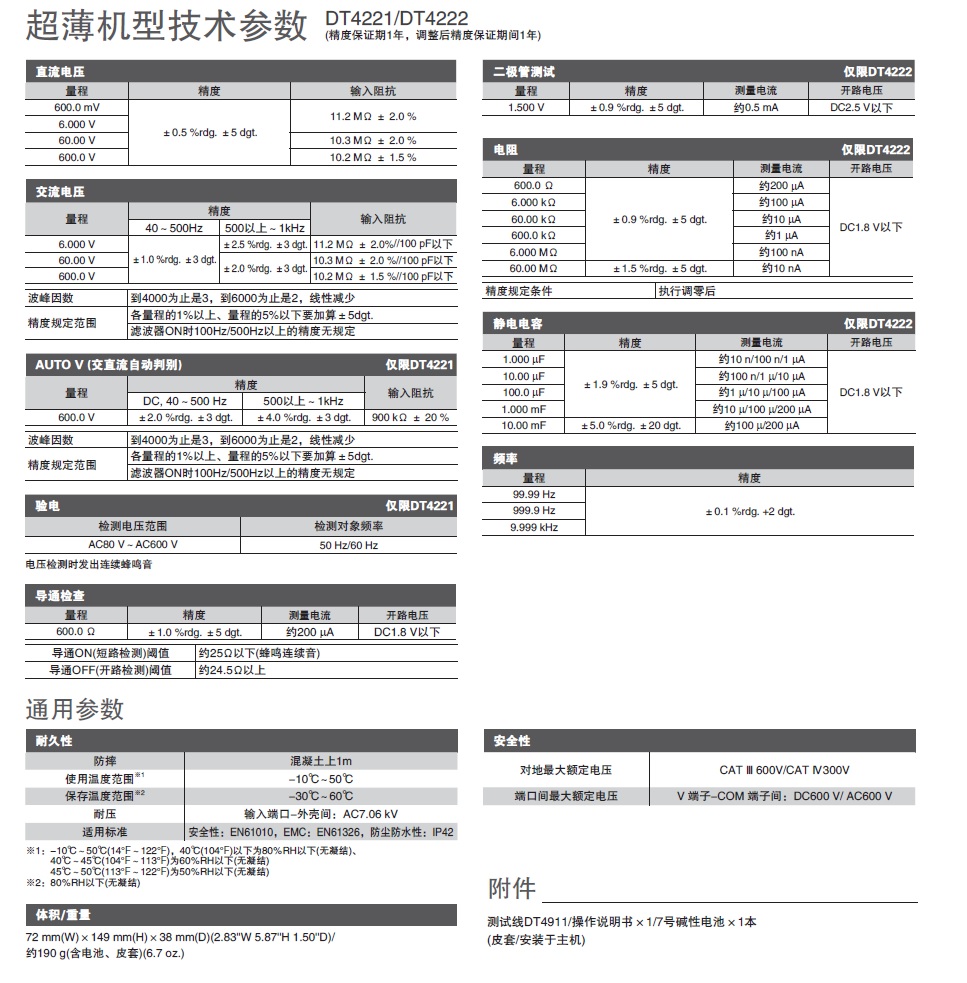 DC V基本精度±0.5%,AC V的频率特性40~1kHz的标准型